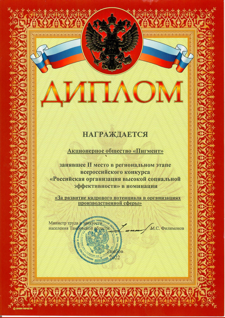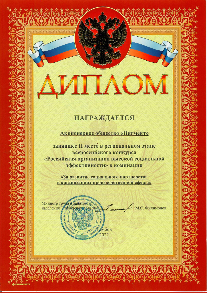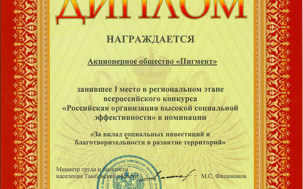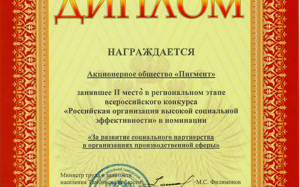 Предприятие АО «Пигмент» стало победителем в следующих категориях – "За вклад социальных инвестиций и благотворительности в развитие территорий" (1 место), "За формирование здорового образа жизни в организациях производственной сферы" (1 место), "За развитие кадрового потенциала в организациях производственной сферы" (2 место), "За развитие социального партнерства в организациях производственной сферы" (2 место).