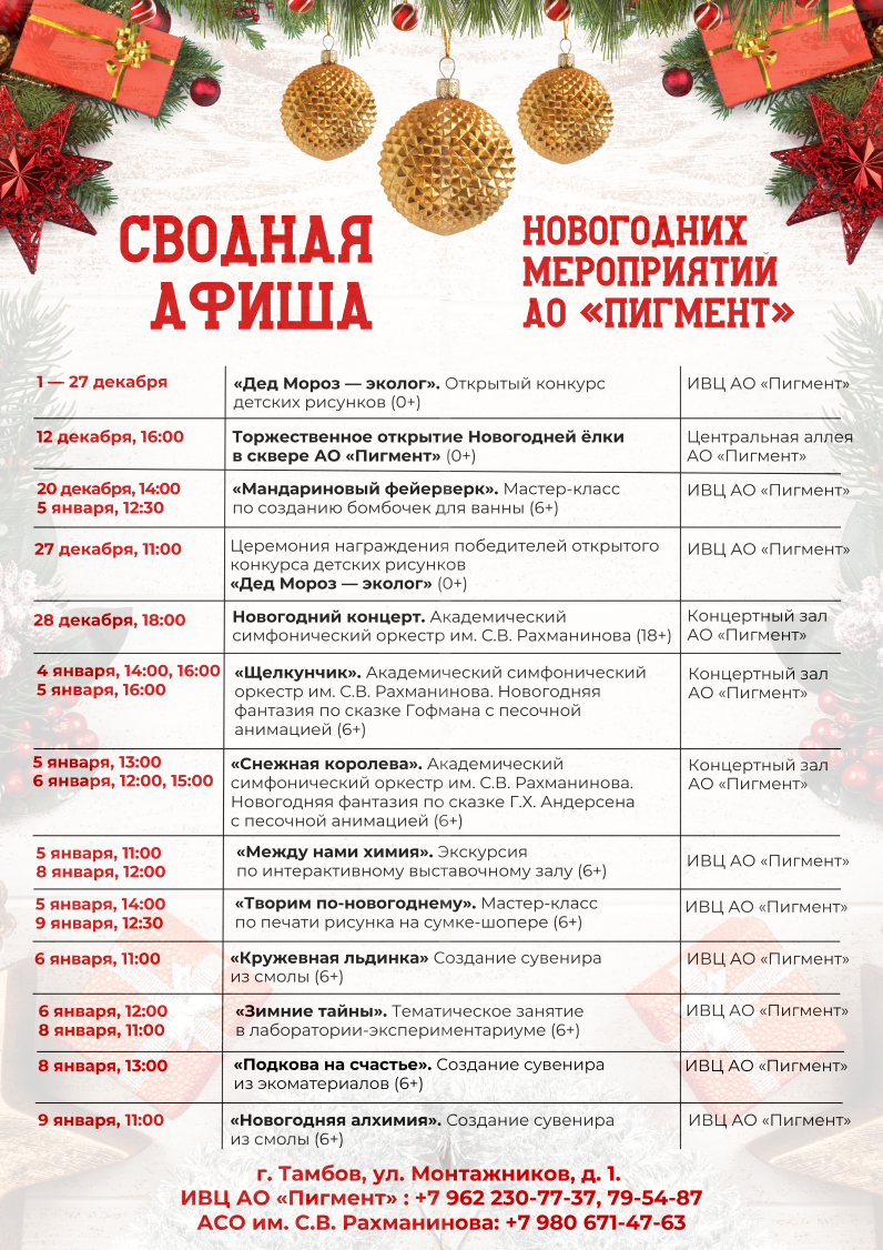 Новогодняя зона будет работать весь декабрь и все новогодние праздники. Все желающие также смогут присоединиться к мероприятиям Информационно-выставочного Центра АО «Пигмент» ivc.krata.ru или просто прогуляться по центральной аллее сквера «Химик».Праздничная афиша АО «Пигмент»: